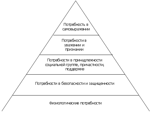 По теории Маслоу все эти потребности можно расположить в виде строгой иерархической структуры, показанной на рис.1. Этим он хотел показать, что потребности нижних уровней требуют удовлетворения и, следовательно, влияют на поведение человека прежде, чем на мотивации начнут сказываться влияния потребностей более высоких уровней. В каждый конкретный момент времени человек будет стремиться к удовлетворению той потребности, которая для него является более важной или сильной. Прежде, чем потребность следующего уровня станет наиболее мощным определяющим фактором в поведении человека, должна быть удовлетворена потребность более низкого уровня.