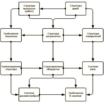 Также малоэффективна, с точки зрения бизнес-системы, практика реструктуризации «снизу вверх». Примером может служить практически любое внедрение известных корпоративных IT – систем. Практика работы «интеграторов» предусматривает проведение «консалтинга» как первого этапа их деятельности. Как правило, цель такого консалтинга состоит в приведении системы управления предприятием в вид, соответствующий типовым моделям автоматизации, т.е. удобный для «автоматизаторов». Естественно, что при этом теряется целенаправленность элементов системы управления, бизнес-система становится ориентированной на решение того круга задач, который заведомо заложен в программное обеспечение, но не того, который бизнес-система должна решать в реальной жизни.