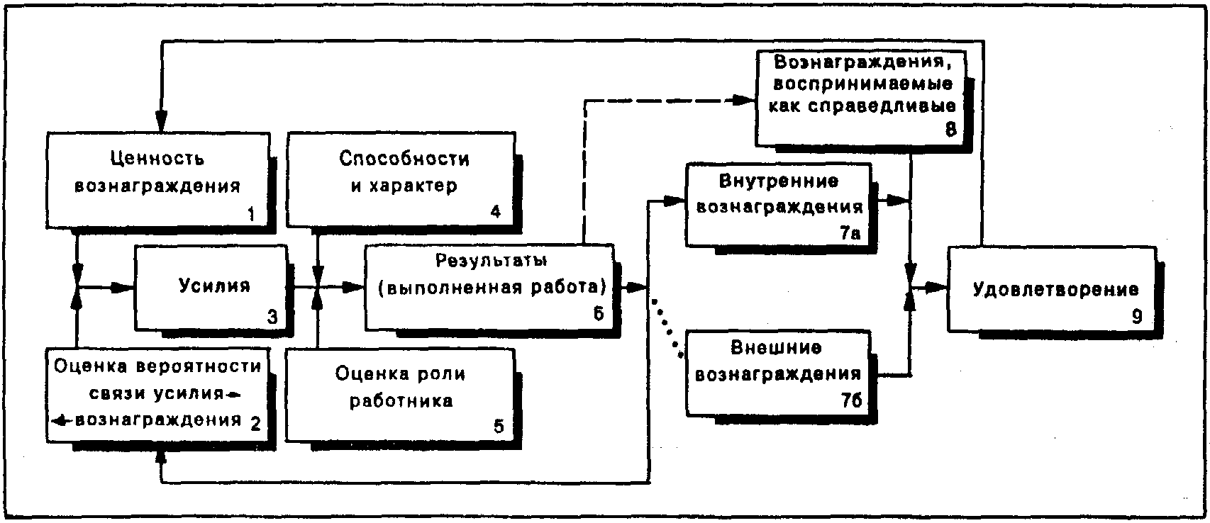 12. Получившая широкую поддержку модель Портера-Лоулера основывается на том, что мотивация является функцией потребностей, ожиданий и восприятия работниками справедливого вознаграждения. Результативность труда работника зависит от приложенных им усилий, его характерных особенностей и возможностей, а также оценки им своей роли. Объем затрачиваемых усилий зависит от оценки работником ценности вознаграждения и уверенности в том, что оно будет получено. Согласно модели Портера-Лоулера результативность труда порождает удовлетворенность, а вовсе не наоборот, как считают сторонники теории человеческих отношений.