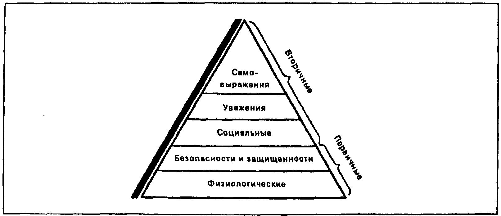 5. Согласно теории Маслоу пять основных типов потребностей (физиологические, безопасности, социальные, успеха, самовыражения) образуют иерархическую структуру, которая как доминанта определяет поведение человека. Потребности высших уровней не мотивируют человека, пока не удовлетворены, по крайней мере, частично потребности нижнего уровня. Однако эта иерархическая структура не является абсолютно жесткой и строгой.