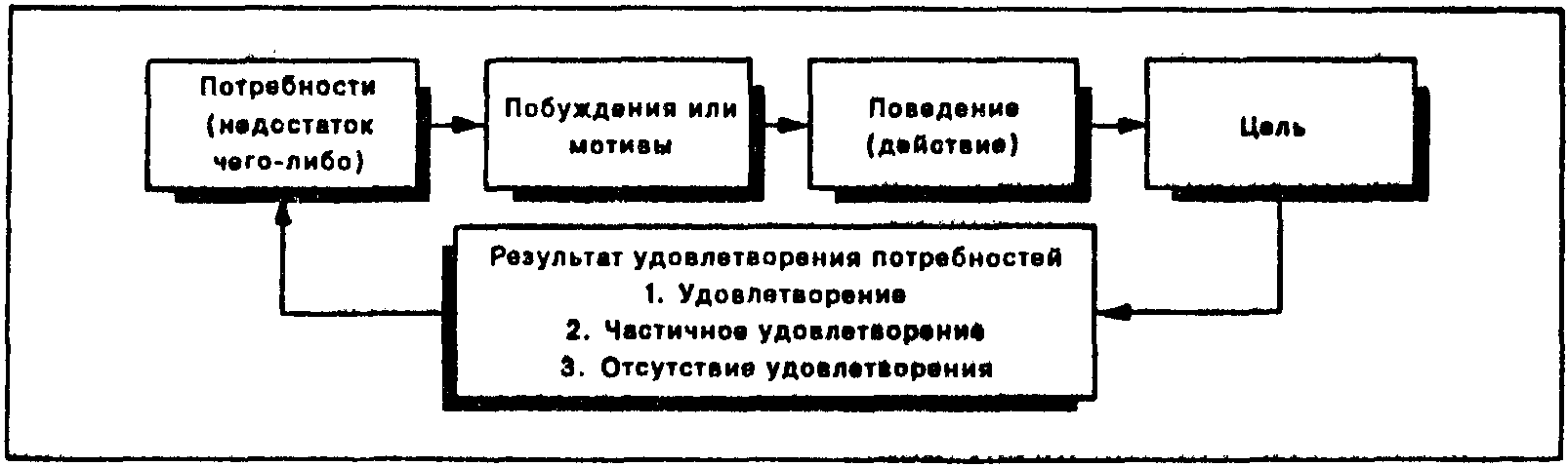 Когда потребность ощущается человеком, она пробуждает в нем состояние устремленности. Побуждение — это ощущение недостатка в чем-либо, имеющее определенную направленность. Оно является поведенческим проявлением потребности и сконцентрировано на достижении цели. Цели в этом смысле — это нечто, что осознается как средство удовлетворения потребности. Когда человек достигает такой цели, его потребность оказывается удовлетворенной, частично удовлетворенной или неудовлетворенной. Например, если вы ощущаете потребность в сложной работе, это может побудить вас попытаться достичь цели в виде получения места, обеспечивающего ее. Получив такое место, вы можете обнаружить, что работа там на самом деле не такая сложная, как вы предполагали. Это может заставить вас работать с меньшим усердием или искать другое место, на котором ваша потребность будет удовлетворена. На рис. 1 показан такой тип поведения.