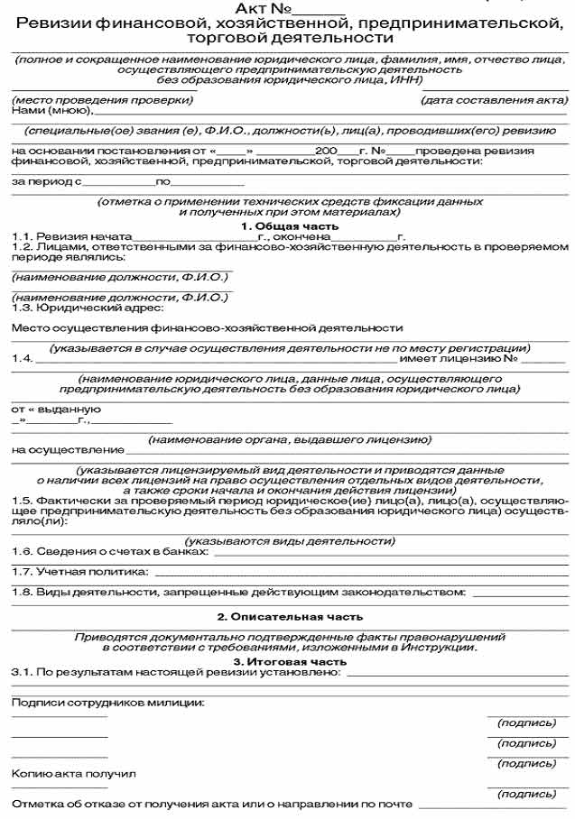В итоговой части акта ревизии подлежат отражению выводы о результатах ревизии. Акт ревизии составляется в трех экземплярах и подписывается всеми проверяющими. Первый и второй экземпляры акта ревизии вместе с прилагаемыми к ним материалами остаются в проверяющих органах. Третий экземпляр акта вручается представителю проверяемого лица под расписку с отметкой в первом экземпляре акта ревизии. В случае отказа от получения акта ревизии, а также при невозможности вручить акт ревизии по иным обстоятельствам, об этом делается отметка в акте ревизии, удостоверенная подписями проверяющих, а экземпляр акта ревизии направляется проверяемому лицу для ознакомления по почте заказным письмом не позднее дня, следующего за днем окончания ревизии.