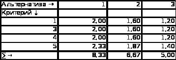 Значения в ячейках есть произведение суммы оценок критериев на веса критериев.