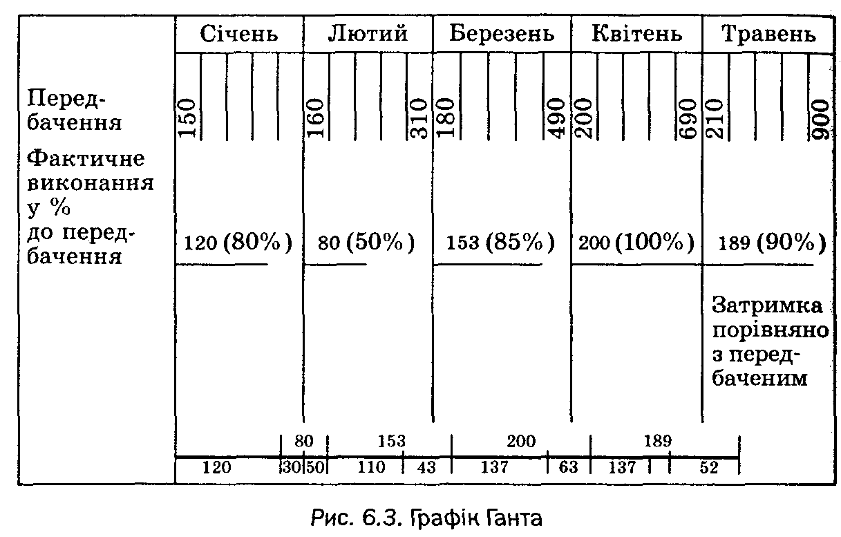 Графік Ганта (названий на честь автора, американського інженера Генрі Ганта) — це таблиця зі стовпцями. У лівому стовпці вказано об'єкт виміру. Інші стовпці відповідають одиницям часу (години, дні, тижні). У верхній частині розташованих таким чином стовпців зліва записують цифру, що вказує на заплановані обсяги робіт, а справа — кумулятивний підсумок планів, розрахований від початку стовпця. На рис. 3 наведено приклад графіка Ганта, який показує розходження між запланованим часом виконання робіт і їх фактичним перебігом.