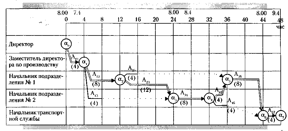 На рис. 7 видно, что в подразделениях № 1 и № 2 появляются отрезки времени, на которых эти подразделения остаются без работы (волнистые линии). В этих случаях целесообразно снять отсюда часть трудовых и технических ресурсов и передать их тому подразделению, работа которого лежит в это время на критическом пути и лимитирует тем самым конечный результат. Так, например, после того как подразделение № 2 в момент, соответствующий 8-му часу работы, выполнит этап I, ему целесообразно передать часть своих ресурсов подразделению № 1 с расчетом, чтобы к событию 3 подразделения № 1 и № 2 подошли одновременно. Для этого нужно передать из подразделения № 2 в подразделение № 1 ровно столько ресурсов, чтобы сократить сумму работ А12 и А23, в подразделении № 1 на 8 часов, то есть до 12 часов. При этом подразделение № 2, лишенное части ресурсов, увеличит время своей работы на эти же 8 часов (работа А13, станет равна 12 часам) и критический путь между событиями 3 и 2 будет равен 12 часам. Это сокращение общего времени критического пути означает и сокращение на то же время – на 8 часов – продолжительности решения всей производственной задачи.