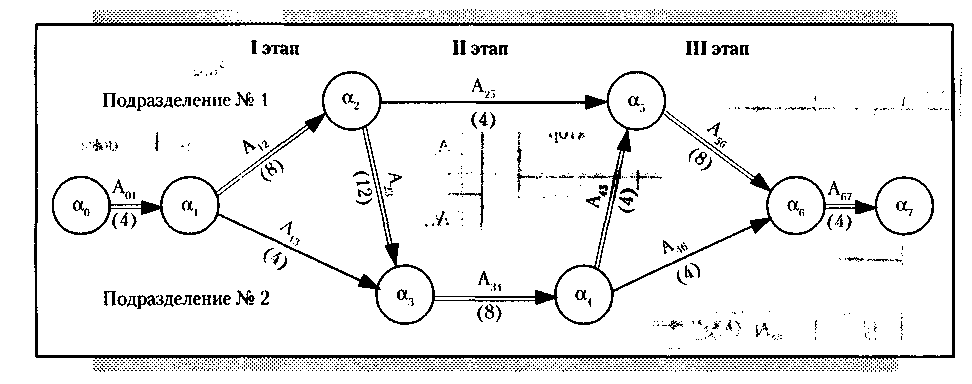 Сетевое планирование рассмотрим на следующем примере. Производственная задача решается в три этапа (I, II и III). Исходным моментом является получение директором предприятия задания (заказа). Далее на основании этого задания под руководством заместителя директора по производству разрабатываются задания подразделениям № 1 и № 2. После этого подразделения одновременно приступают к I этапу работы. Для того чтобы начать II этап работы, подразделение № 2 должно получить комплект изделий, изготовленных подразделением № 1 в ходе I этапа. Поэтому подразделение № 1 начинает II этап работы сразу же после окончания I этапа, а подразделение № 2– лишь после получения комплектующих из подразделения № 1. Далее роли подразделений меняются: для того чтобы начать III этап, теперь уже подразделение № 1 должно ожидать комплектующих от подразделения № 2. С окончанием III этапа работы обоими подразделениями изделие считается готовым. Транспортная служба доставляет его потребителю.