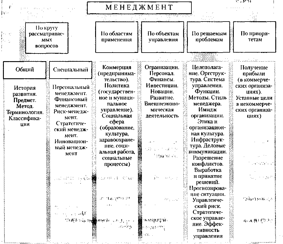 Сегодня менеджмент как наука и практическая деятельность представляет собой разветвленную и достаточно сложную систему знаний. Для облегчения ориентировки в этой системе целесообразно классифицировать менеджмент применительно к кругу рассматриваемых вопросов, областям применения, объектам управления, решаемым проблемам и приоритетам (рис. 1.3).