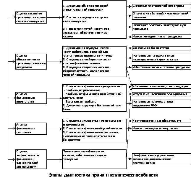 Основним критерієм прояви кризової ситуації на підприємстві є його неплатоспроможність – неможливість підприємства погасити свої зобов'язання. Вона виявляється в порушенні фінансових потоків, що забезпечують виробництво і реалізацію продукції. Причинами неплатоспроможності є фактори, що впливають на зниження чи недостатній ріст виторгу від реалізації і випереджальний ріст зобов'язань. Спад виробництва, ознаки соціального банкрутства, високий ступінь зносу основних засобів, низька ліквідність оборотних коштів - кожної з цих взаємозалежних факторів може стати причиною неплатоспроможності підприємства. Неплатоспроможність виявляється в такім розміщенні і використанні фінансових ресурсів, при якому підприємство на може погасити свої зобов'язання перед кредиторами.