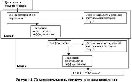 Конфронтация может закончиться и созданием безвыходной ситуации. Безвыходные ситуации принуждают стороны к дальнейшей детализации, за которой вновь следует конфронтация. Последовательность структурирования конфликта приведена на рисунке 2.