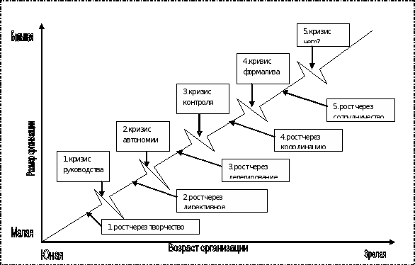 Следующая модель развития организации была предложена Грейнером. Он полагает, что проходят через пять последовательных стадий.