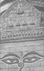 В свое время мне пришлось прочитать немало книг по религиям Востока, теософскую литературу, исторические очерки Рерихов. И во всех источниках упоминались цивилизации, существовавшие до нашей. Однако современная наука хранила молчание по поводу этих данных. Палеонтология находит до сих пор кости древних животных, но нет никаких доказательств существования древних рас. И только директор Всероссийского центра глазной и пластической хирургии (г.Уфа), глазной хирург, член Международной академии наук Э.Р. Мулдашев в книге «От кого мы произошли» начал раскрывать данную тему. Этот человек, занимающийся глазной хирургией задался вопросом: «Почему у всех людей на свете, независимо от физических характеристик имеется одна постоянная величина размеры роговицы?». И действительно, если взять грудного ребенка, работающего мужчину и пенсионера, у них у всех диаметр роговицы будет различаться только на сотые доли миллиметра. Зачем природе нужны такие вещи? Может быть, глаза несут какую-то важную информацию о человеке? Да и во многих древних писаниях говориться о глазах, как о вратах души человека. После этого была разработана компьютерная программа, анализирующая геометрический рисунок в области глаз человека, диагностирующая ряд болезней по этим данным и даже восстанавливающая примерный образ человека. Были проведены испытания, в результате которых эффективность данной диагностики составила примерно 80-90 %. Так Э.Р. Мулдашев убедился в том, что человеческие глаза могут рассказать многое. И в это время ему в руки попал снимок храма в Тибете. На стене этого храма были изображены необычные глаза некоего существа (рис. 1).