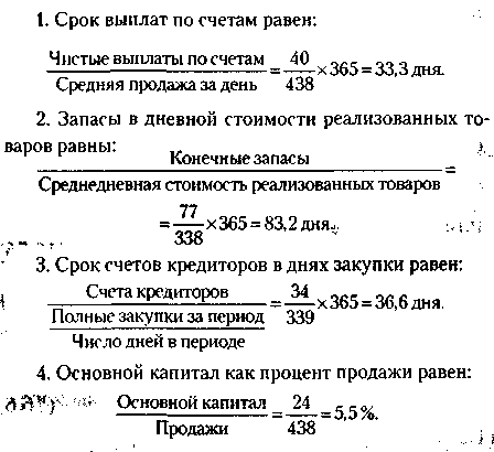 3. Срок счетов кредиторов в днях закупки характеризует покупку товаров в кредит. Он показывает, сколько дней требовалось фирме, чтобы оплатить товар, купленный в долг. Это дает возможность сделать выводы о степени зависимости предприятия от торгового кредита. Если данный показатель больше определенной величины (она дается практикой), это может означать, что кредитор вот-вот прекратит поставки или потребует немедленной выплаты долгов. Пострадает и репутация фирмы. С другой стороны, выплачивая кредиты раньше этого срока, фирма также сокращает свои возможности.