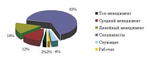 Соотношение персонала по категориям работников удовлетворительное и способствует решению оперативных и стратегических задач. Основную массу составляют специалисты - 65% и руководители - 28%.