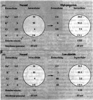 Вход калия и хлора сопровождается током в клетку некоторого количества воды, приводящим к небольшому увеличению объема клетки. В процессе достижения нового состояния равновесия концентрация калия возрастает с 90 до 91 ммоль, хлора - с 4 до 7,9 ммоль, а объем клетки увеличивается на 3,5%. На первый взгляд кажется, что количество вошедшего в клетку хлора превышает количество калия, но представим себе, каковы были бы эти концентрации, если бы объем клетки не увеличился: концентрации обоих ионов были бы выше на 3,5%. Следовательно, вместо 7,9 ммоль концентрация хлора была бы 8,2 ммоль, а концентрация калия была бы на уровне 94,2 ммоль, то есть увеличение обеих концентраций составило бы 4,2%. Таким образом, сначала калий и хлор входят в клетку в приблизительно равных количествах (за исключением незначительного количества, необходимого для изменения заряда на мембране), а уже затем вода втекает в клетку, снижая концентрации обоих ионов до окончательного уровня.