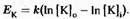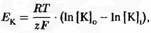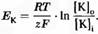 Какой именно потенциал необходим для того, чтобы уравновесить эффект реальной разницы концентраций ионов калия? Предположение о том, что Е>к> просто пропорционален разнице между внутриклеточной [К]>i> и внешней [К]>0> концентрацией ионов калия, не совсем верно. Точнее, равновесный потенциал зависит от разницы между логарифмами концентраций: