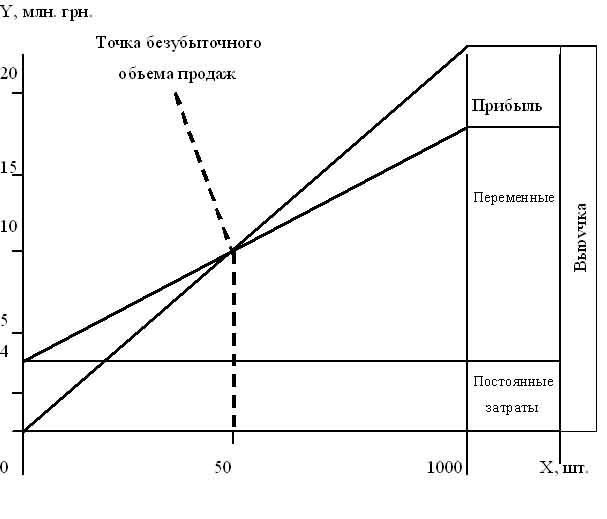 Полученную зависимость можно представить по-другому (рис.3.4). При объеме реализации, равном нулю, предприятие получает убыток в размере суммы постоянных расходов. При объеме 1000 изделий прибыль составит 4 млн. грн. Соединив эти точки между собой, получим на линии X точку критического объема продаж.