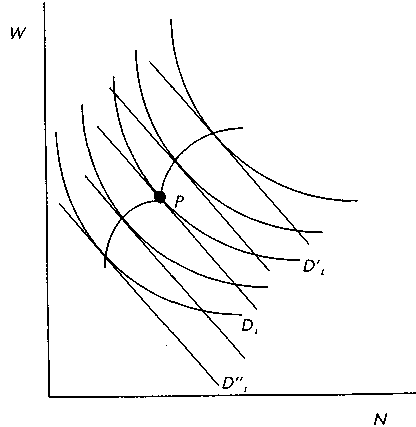 Причем и могут быть интерпретированы как «минимально необходимые уровни» заработной платы и занятости соответственно, а (W ) и (N ) — как дополнительные для членов профсоюза уровни заработной платы и занятости. Параметр показывает относительную важность для профсоюза дополнительной заработной платы или дополнительной занятости, 0 < <1.