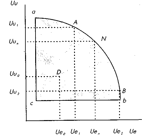 В этом множестве есть точки, которые улучшают положение обеих сторон (например, точка D), и поэтому решения, приводящие к ним, могут быть достигнуты в ходе переговоров сравнительно легко и без конфликтов. Когда при существующей силе сторон такие решения исчерпаны и переговоры приводят к точке N, дальнейшее улучшение положения одной из сторон может быть осуществлено только при ухудшении положения другой стороны. Так, переход в точку А из точки N увеличит полезность профсоюза, но уменьшит
