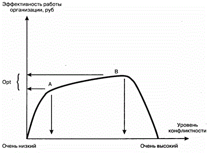 Из графика (рис. 2) видно, что бесконфликтность (безразличие всех ко всему) и очень высокая конфликтность обусловливают снижение эффективности деятельности организации. Таким образом, существует оптимальный уровень конфликтности (зона от точки А до точки В), обеспечивающий нормальное функционирование организации.