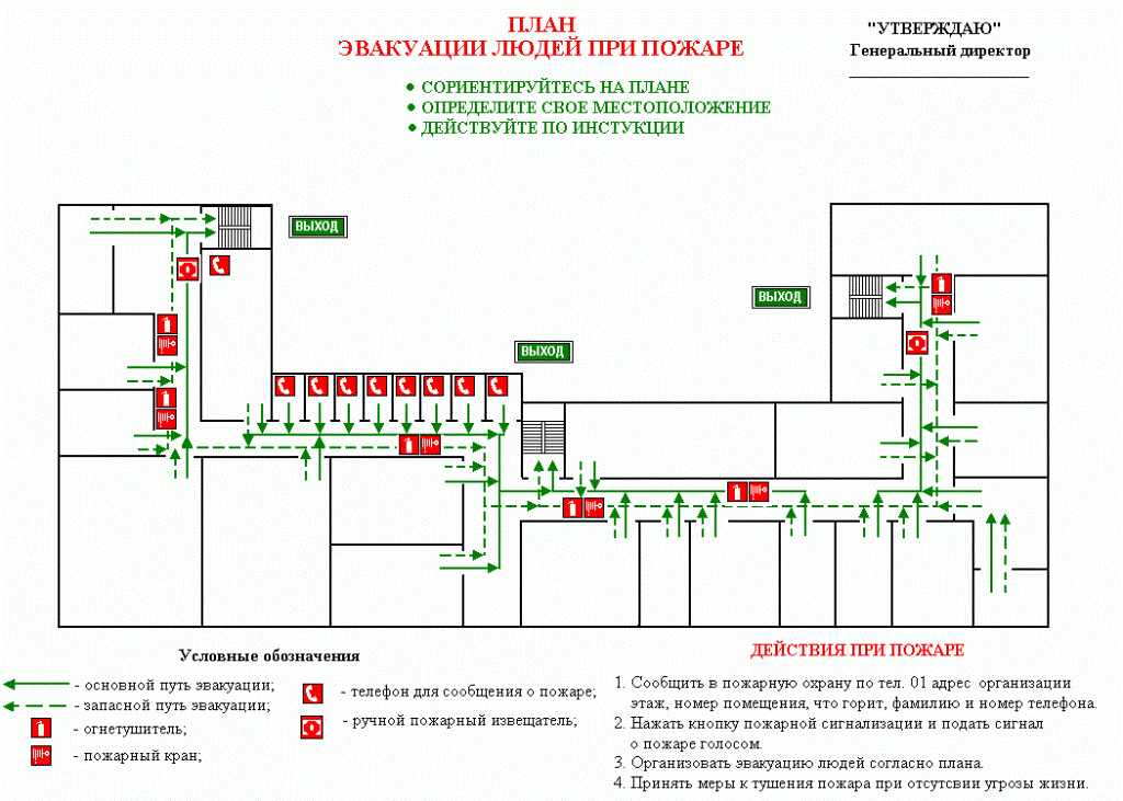 На планах эвакуации должно быть условными знаками показано размещение огнетушителей, пожарных кранов, телефонов, мест включения систем пожарной автоматики и др.