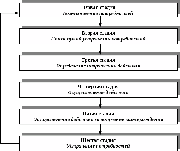 Шестая стадия – устранение потребности. На этой стадии человек либо прекращает деятельность до возникновения новой потребности, либо продолжает искать возможности и осуществлять действия по устранению потребности.