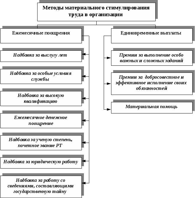 Материальное поощрение. Сюда относятся стимулы в материально – вещественной форме: заработная плата и тарифные ставки, вознаграждение за результаты, приме из дохода и прибыли, компенсации, путевки, кредиты и ссуды и т.д.