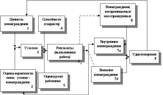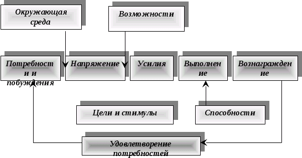 Внутренние потребности и побуждения индивида создают напряжение, на которое оказывает влияние внешняя среда. Используя свои возможности, а также соотносясь с целями, поставленными перед ним, работник предпринимает определенные усилия по удовлетворению своих потребностей. На реализацию данных усилий влияют также личные способности человека. Производительный труд работника предполагает его поощрение организацией. Если сотрудник получает адекватное вознаграждение, его исходные потребности удовлетворяются. Со временем возникают новые потребности, и цикл повторяется.12