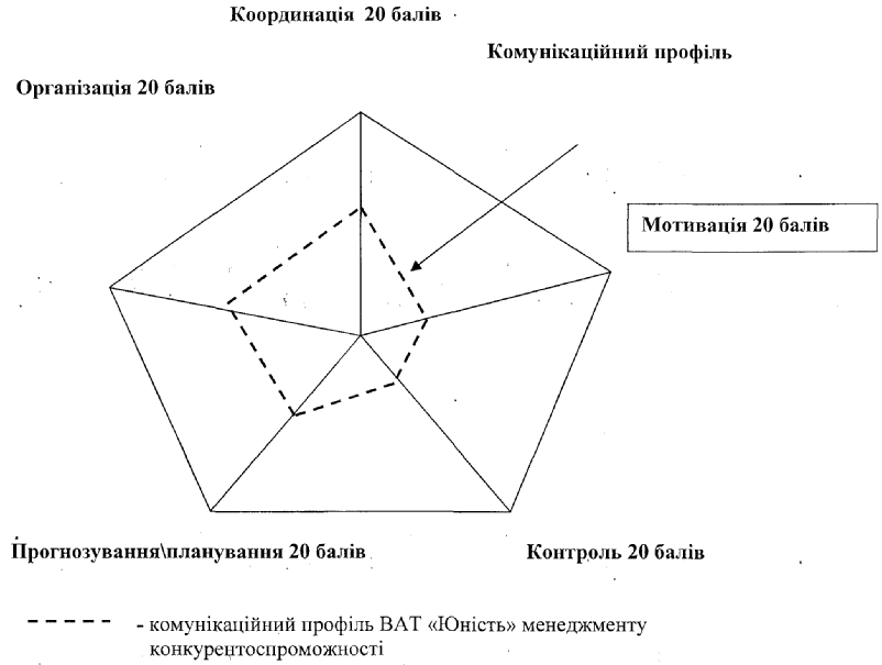 6.Для контролю за конкурентоспроможністю ВАТ «Юність» була запропонована пентограма (рис.3.5), що дає підставу стверджувати про те, що запропоновані заходи щодо оптимізації діяльності менеджменту конкурентоспроможності позитивно вплинули на діяльність підприємства і в порівнянні з минулим аналізом покращили свій показник комунікаційний профіль(з 56 балів до 79 балів),тим самим дає змогу підприємству перейти до якісно нового рівня розвитку менеджменту, тому доцільно проводити періодично функціональну оцінку для підтримки та удосконалення рівня менеджменту з метою визначення ефективності поліпшень і динаміку побудови конкурентоздатної системи управління.