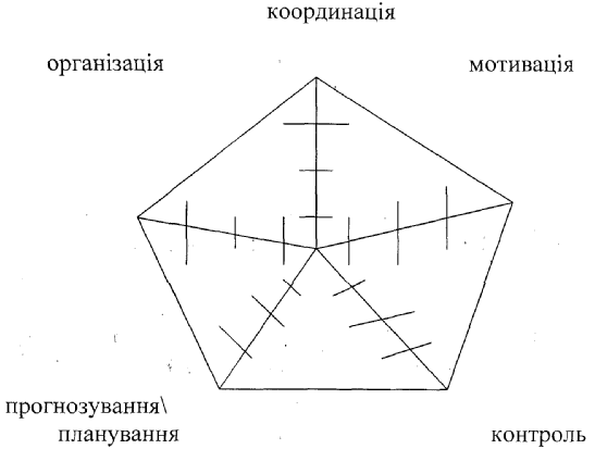 Для наочного представлення результатів оцінки доцільно перенести їх на пентаграму, на яку може бути накладений комунікаційний профіль організації, побудований з обліком по кожному з п'яти оцінних критеріїв функціональної моделі (рис.3.5).