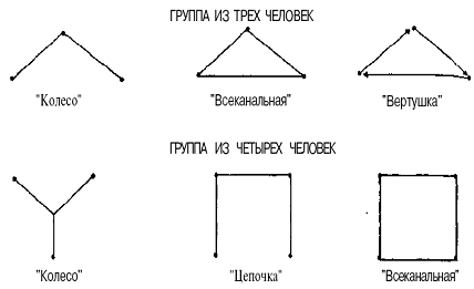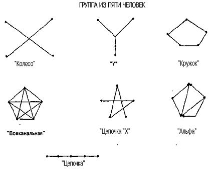 Существуют устоявшиеся образцы коммуникационных сетей для групп одной и той же или разной численности (Приложение № 2). В сетях типа "кружок" члены группы могут коммуницировать только с теми, кто расположен рядом с ними. В сетях типа "колесо" представлена формальная, централизованная иерархия власти, при которой подчиненные коммуницируют друг с другом через своего начальника. Объективной основой такой ситуации является то, что лицо, находящееся в центре "колеса", имеет больше коммуникационных связей, чем другие члены группы. Он получает больше посланий, чаще признается другими членами группы как лицо, выполняющее лидерские функции, больше оказывает социального влияния на других членов группы, обычно несет большую ответственность за передачу информации, от него больше, чем от других, ожидается окончательное решение проблемы.