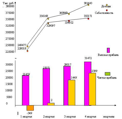 За период отчетного года доходы предприятия выросли с 249,4 млн. руб. до 381,6 млн. руб. (темп роста составил 153,0%). При этом себестоимость продукции росла более высокими темпами – 153,6%, что следует признать как отрицательную тенденцию. Прибыль от реализации продукции в четвертом квартале по сравнению с первым увеличилась с 21459 тыс. руб. до 31472 тыс. руб.