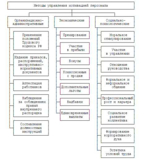 Методы мотивации труда аналогичны методам, используемым в управлении персоналом вообще. Среди них есть общие, широко применяемые в управлении другими объектами (производством, народным хозяйством в целом): административные, экономические, социальные - и большое количество конкретных частных методов. Управление персоналом и, в частности, мотивацией труда должно основываться на принципах системного подхода и анализа, что означает охват всего кадрового состава предприятия, увязку конкретных решений в пределах подсистемы с учетом влияния их на всю систему в целом, анализ и принятие решений в отношении персонала с учетом факторов внешней и внутренней среды во всей полноте взаимосвязей.