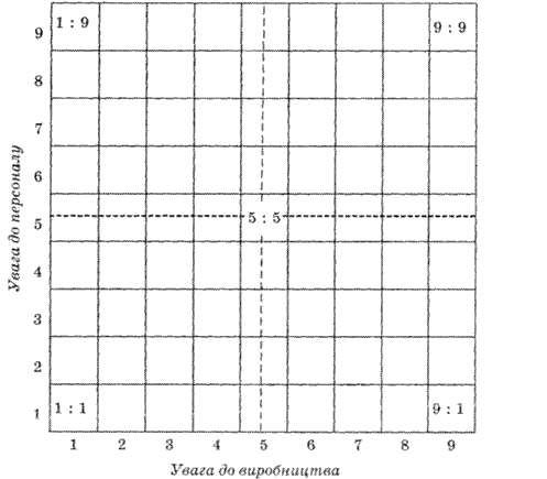 Ця згадка в закодованому вигляді подає 5 базових типів поведінки керівника: 9:1—диктатор (авторитарний, директивний тип управління); головну увагу приділяє виробництву і недостатньо уваги звертає на окремих людей і колектив у цілому; 1:9 —демократ (колективістський тип, свій хлопець); головну увагу приділяє людям, зміцненню колективізму та створенню сприятливого морально-психологічного клімату в колективі; 1:1—песиміст (ліберальний тип, невтручання); не приділяє уваги ні людям, ні виробництву. Він не на своєму місці; 9:9—організатор (діловий тип, компетентний); максимум уваги приділяє людям і виробництву; 5:5—маніпулятор (виважений тип, інтелектуал); приблизно порівну свою увагу приділяє людям і виробництву. Названі типи є основою для декодування в усіх квадратах ґратки.