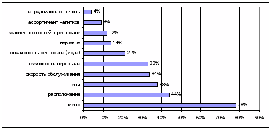 Потребители, выбирая ресторан для посещения всей семьей, больше всего обращают внимание на «стоимость блюд» – 83% респондентов отметили этот фактор как наиболее значимый. На втором месте, по значимости, – «вкусовые качества блюд» (66% респондентов). Третье место занимает «качество обслуживания в ресторане» (61,7% респондентов).