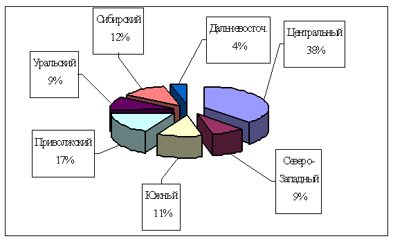 Анализ рис. 5 показывает, что основную долю в российском обороте оптовой торговли (57%) занимает Центральный федеральный округ. Крупнейшие оптовые компании расположены именно в этом округе.