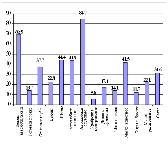 На рис. 7 представлен удельный вес продажи отдельных товаров организациями оптовой торговли в ресурсах данного товара в декабре 2008 года, в процентах.
