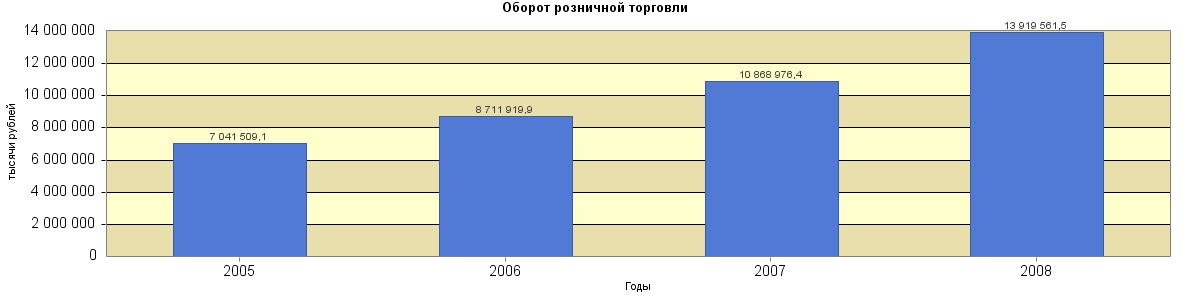 Оборот розничной торговли в 2008 году вырос по отношению к 2007 году на 28 % и составил 13919,6 млрд. рублей. В 2008 году оборот розничной торговли на 86,9% формировался торгующими организациями и индивидуальными предпринимателями, осуществляющими деятельность в стационарной торговой сети (вне рынка); доля розничных рынков и ярмарок составила 13,1% (в 2007 году – соответственно 84,9% и 15,2%) .