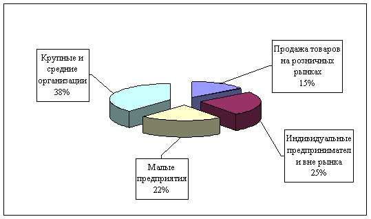 В общей структуре формирования оборота розничной торговли продажа товаров на розничных рынках в 2008 г. снизилась по отношению к 2007 г. с 20% до 15%, продажа крупными и средними организациями, наоборот, повысилась с 33% до 38%.