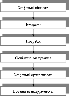 Переростання потенціалу напруженості в реальну, тобто відкрито виявлену напруженість, що матеріалізується в соціальних очікуваннях, позиціях індивідів (чи груп), у їхніх конкретних соціальних діях, означає, що сформувався суб’єкт конфліктної дії, здатний ініціювати конфліктну ситуацію (рис. 1.3).