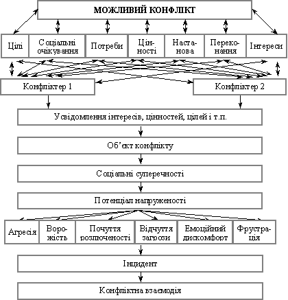 Необхідними й достатніми умовами виникнення конфлікту є наявність у суб’єктів соціальної взаємодії протилежно спрямованих мотивів і суджень, а також стан протиборства між ними [2].