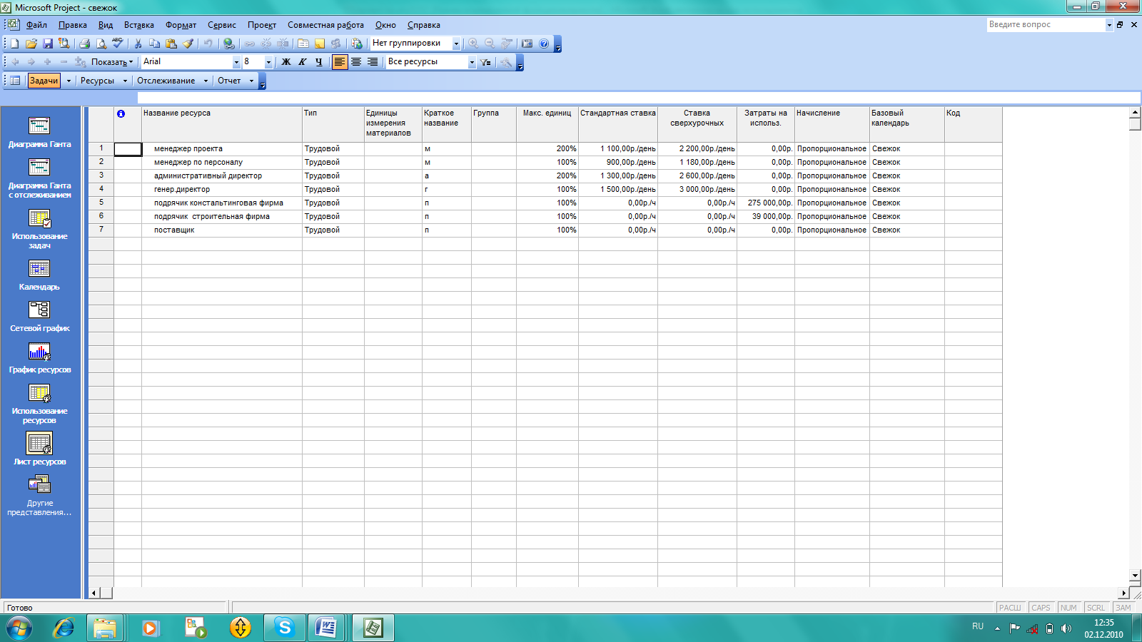 Ресурсы, необходимые для реализации проекта: два менеджера проекта, менеджер по персоналу, два административных директора, генеральный директор, консалтинговая фирма и строительная организация