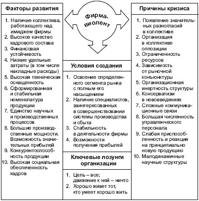 Третий этап – виолентный (рис. 7.): организация достигает зрелого состояния, устойчивого положения на рынке, конкурентоспосбность ее высока, она чувствует себя уверенно. Фирмы-виоленты – это фирмы с силовой стратегией, которые, как правило, работают в области большого бизнеса, характеризуются высоким уровнем освоенной технологии, массовым выпуском продукции.