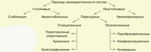В результате жизнедеятельности систем происходит изменение тенденций их существования. Периоды изменения тенденций жизнедеятельности систем в результате исчерпания внутренних возможностей системы (потенциала системы) или же под воздействием внешних факторов являются переходными периодами или — в отдельных случаях — кризисами. В связи с этим необходимо опираться на классификацию переходных периодов.3