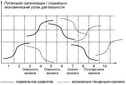 Опасность и вероятность кризисов в тенденциях циклического развития организации.