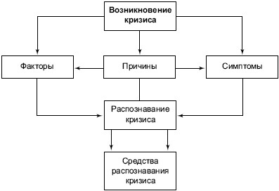 Для того чтобы распознать кризис, необходимо своевременно обнаружить симптомы, определить факторы, свидетельствующие о возможности наступления кризиса, и выявить его причины. Средствами обнаружения возможности наступления кризисной ситуации в организации служат интуиция и опыт, анализ и диагностика состояния. Их следует применять на всех этапах существования организации, ибо возможна ситуация, при которой она может войти в глубокий кризис на пике своего развития или при весьма благоприятной внешней экономической обстановке.7