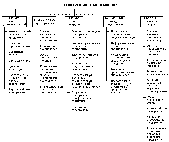 Имидж предприятия у потребителей составляют представления людей относительно уникальных характеристик, которыми, по их мнению, обладает продукция предприятия: качество, дизайн, известность торговой марки; предоставляемые предприятием сервисные услуги и система скидок; цена на продукцию; представления потребителей о заявленной миссии и стратегиях предприятия, а также его фирменный стиль.