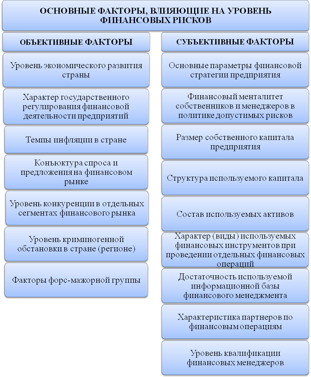 финансовый риск является одной из наиболее сложных категорий, возрастает степень влияния финансовых рисков на результаты финансовой деятельности предприятия, поэтому приводит к необходимости детального изучения сущности, содержания и видов финансовых рисков;