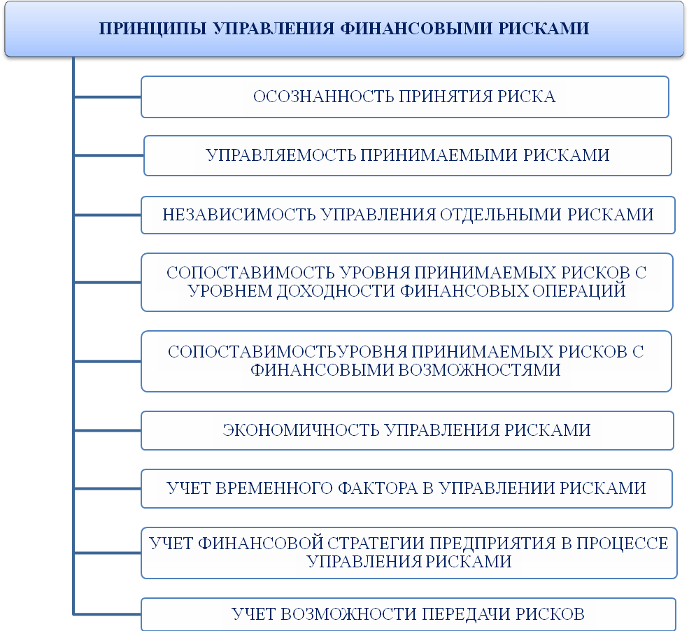 раскрыт процесс управление финансовыми рисками, который с учетом набора принципов, подбора методов, формирует политику управления финансовыми рисками, в результате выявляют факторы, влияющие на уровень финансовых рисков, и разрабатывают внутренние механизмы их нейтрализации.