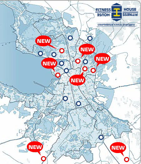 Также в 2010 году ожидается открытие еще 7 современных спортивных клубов, в таких густонаселенных районах города, как Невский, Красногвардейский, Василеостровский, Приморский, а также в Ленинградской области, в городах Кириши и Гатчина. Схема расположений всех клубов сети представлена на рисунке 1- Схема расположений клубов сети «Фитнес Хаус».