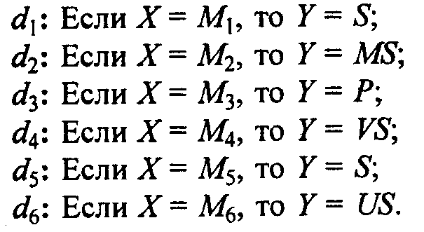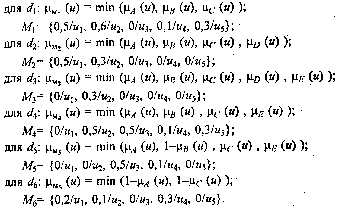 Правило d4 исключим из рассмотрения, так как теперь кандидат, не владеющий умением работать с ПО, не является ОЧЕНЬ УДОВЛЕТВОРЯЮЩИМ. Тогда соответствующие левым частям правил нечеткие множества Мi, i = 1, .... 6, i 4, будут иметь вид: